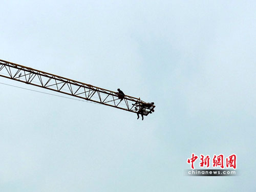 中新網柳州6月3日電(羅海生 黃坤軍)6月3日,廣西柳州市東環路一在建工地35米高的塔吊頂端,三名農民工為了討薪欲跳塔。接警后柳州特勤消防大隊迅速出動一臺多功能救援車、1臺53米云梯車,9名官兵趕赴現場救援,經過近一個小時的勸說三民男子才放棄了輕生的念頭。