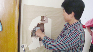 記者看到304室北面小屋的門,有一部分用牛皮紙貼上,輕輕撕開紙,赫然出現一個大洞。她說這是有天早晨喊女兒起床時敲通的。一個年過半百的女子,竟然敲門時就輕易地把門敲通,可見這門板的質量。果然,記者很輕易就掰下一塊面板,這種復合木板的厚度不到3毫米,難怪經不起“敲”。