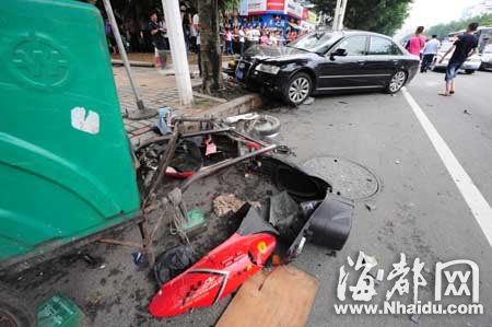 目擊者鄭小姐說,當時她騎著電動車,在豪華轎車后面,與其同向行駛。豪華轎車先刮碰到一名騎自行車的女子,接著,非機動車道上一名騎摩托的男子和一名騎電動車的男子被撞飛,高度超越小車車頂,又重重摔到了人行道上。附近商家則說,豪華車是為躲避騎自行車的女子,打方向盤向右避讓,隨即撞上兩名騎車的男子。“如果沒這棵樹就慘了,可能更多人被撞。”高先生的小車當時就停在事發地附近等朋友。他說,他先是聽到一聲刺耳的剎車聲音,循聲看去,看到兩名騎車男子被撞飛。另有目擊者說,豪華車撞人后繼續往前沖,撞倒路邊的電話亭,再撞上行道樹后才停下。受傷的三人中,一人昏迷不醒,滿身是血。豪華車司機沒有受傷。