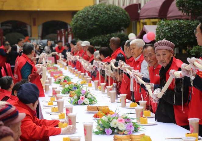 重慶:養老院擺長桌面條宴迎重陽