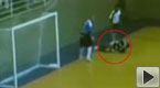 實拍:一室內足球隊員滑倒被地板碎片