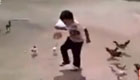 實拍男孩手拿美食遭雞群圍攻