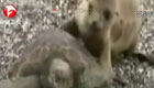 實拍胖海獅騎著海龜逛沙灘