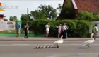實拍波蘭警車陪同護送白天鵝過馬路