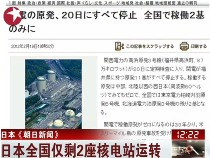 日本《朝日新聞》稱,目前日本全國僅剩2座核電站運轉。
