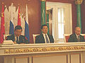 “上海合作組織” 的前身是“上海五國”會晤機制。2001年6月14日—15日,“上海五國”元首在上海舉行第六次會晤 ,烏茲別克斯坦以完全平等的身份加入“上海五國”。15日,六國元首舉行了首次會議并簽署了《“上海合作組織”成立宣言》 ,“上海合作組織”正式成立。