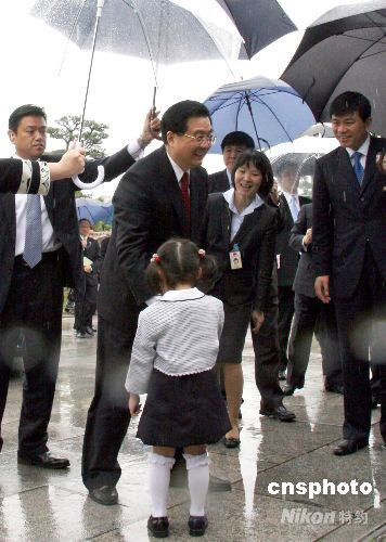 圖:胡錦濤主席在雨中接受日本小姑娘的獻花