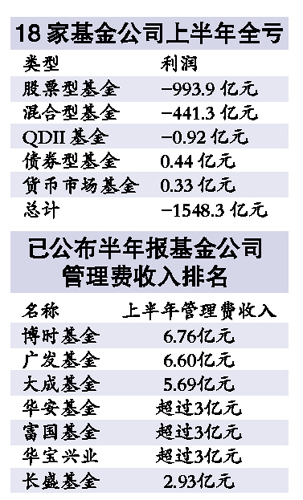 18家基金公司旗下234只基金的半年報面世,基金業利益鏈昭然若揭:今年上半年,已披露半年報的基金共計虧掉基民1548億元,但基金公司管理費收入不減反增,半年大賺51.13億元, 比去年同期多收了16.01%;基金銷售渠道更是坐收漁利,上述基金上半年共計支出客戶管理費高達7.04億元,同比增長了13.28%。