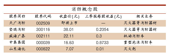 某不愿具名的私募人士向 《每日經濟新聞》記者介紹,目前A股市場包括即將上市的天廣消防(002509)在內,涉及到消防器材及其相關領域的上市公司共有5家。其中,9月份剛登陸創業板的堅瑞消防(300116,收盤價38.01元)和即將登陸深圳中小板的天廣消防均為一線消防設備生產制造商;威海廣泰(002111,收盤價22.11元)等公司為輔助設備生產制造商。