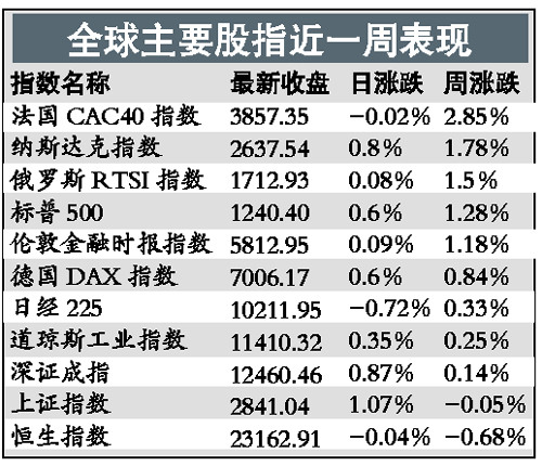 雖然中國A股近期萎靡不振,但其他多數股指表現搶眼,其中,受利好數據提振,美國道瓊斯指數上周五報收11410.32點,上漲0.35%,且已經實現連續兩周走高。其中,納斯達克收盤創下2007年12月以來的新高。而法國股市更是以2.85%的單周漲幅領漲全球股市。