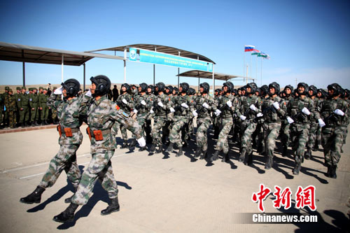 9月24日,“和平使命-2010”上海合作組織成員國武裝力量聯(lián)合反恐軍事演習(xí)戰(zhàn)役實施階段實兵演練,演練在哈薩克斯坦南部馬特布拉克訓(xùn)練場正式舉行。當(dāng)天下午在野戰(zhàn)兵營為聯(lián)演中表現(xiàn)優(yōu)異的各方軍官和士兵代表舉行頒獎儀式,圖為中方參演部隊官兵分列式走過儀式主席臺。