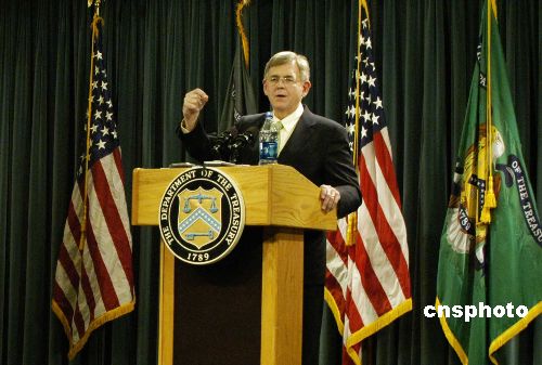 美國財政部12月7日舉行記者會,該部中國事務特使霍爾默(Alan Holmer)在記者會上透露,下周美國財長保爾森將率團前往北京出席第三次中美戰略經濟對話,美方代表團成員包括商務部長古鐵雷斯、衛生與公共服務部長萊維特、貿易代表施瓦布、環保署長約翰遜、代理農業部長康納等高級官員。中新社發 邱江波 攝