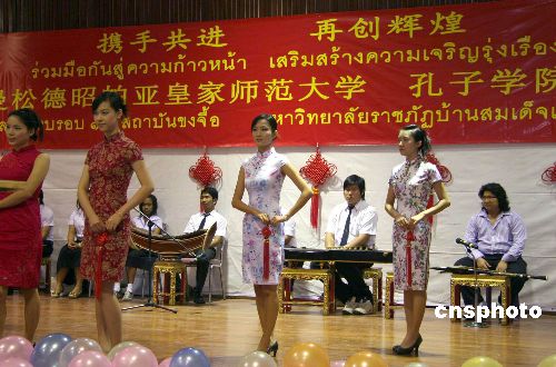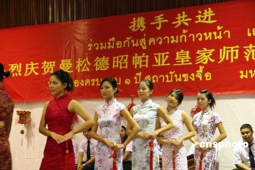 泰國曼松德昭帕亞皇家?guī)煼洞髮W(xué)孔子學(xué)院十九日在該校隆重舉行孔子學(xué)院成立周年慶典活動(dòng),慶典儀式后泰中兩國學(xué)生以“多元文化的融合,和諧世界的構(gòu)建”為主題共同表演了一場(chǎng)精彩的文藝演出,圖為泰中兩國學(xué)生的旗袍服裝表演。中新社發(fā) 顧時(shí)宏 攝