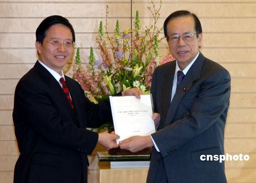 圖為華人教授會代表朱建榮向福田康夫首相遞交建議書。