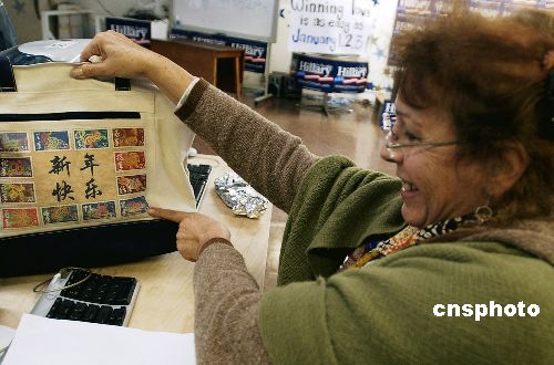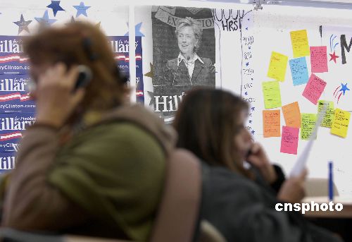 二零零七年的最后一個周末,美國,設于舊廠房中的希拉里舊金山競選總部的義工們加班加點,給愛荷華州的選民打電話,號召民主黨的選民們為希拉里投票。中新社發 陳鋼 攝