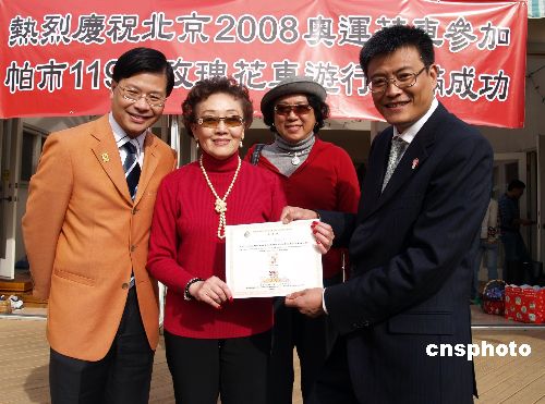 當(dāng)?shù)貢r間1月1日下午,南加州華人社團聯(lián)合會舉行派對,慶祝北京奧運玫瑰花車在美國洛杉磯第119屆帕薩迪娜玫瑰花車游行中勇奪“最佳主題大獎”。參加玫瑰花車表演的北京二中學(xué)生、中國雜技團和中國京劇院演員122人露出勝利歡笑。北京奧運組委會新聞宣傳部長蕭培向南加州華人社團聯(lián)合會主席張素久頒感謝狀,感謝華人華僑對北京奧運的支持。中新社發(fā) 盧威 攝