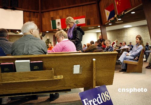 美國艾奧瓦州當地時間1月3日舉行美國2008總統大選的首場初選。圖為艾奧瓦中部小鎮厄本代爾的一個共和黨選區現場。共和黨人赫卡比在當晚選舉中勝出。中新社發 李靜 攝