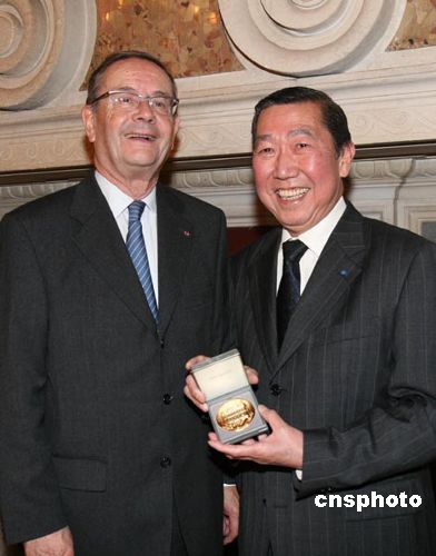 當(dāng)?shù)貢r間1月7日,法國納伊市市長巴依向旅法僑界知名華裔人士何福基(右)頒授榮譽(yù)獎?wù)拢员碚盟麨榇龠M(jìn)法中友好與合作及亞裔融入法國社會做出的積極貢獻(xiàn)。與法國總統(tǒng)薩科奇相識三十多年的何福基,是該市的一位知名人士,2007年底薩科奇首次訪華時,何福基曾作為代表團(tuán)中唯一的華裔人士隨同訪問。中新社發(fā) 鐘誠 攝