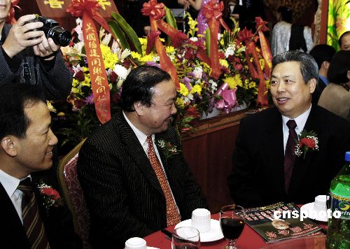當?shù)貢r間一月八日晚,中國駐紐約總領事館總領事彭克玉大使(右)在紐約曼哈頓華埠美東僑界為他舉辦的歡迎晚宴上與華聯(lián)總會共同主席梁冠軍(左)和陳清泉(中)親切交談。中新社發(fā) 鄧悅 攝