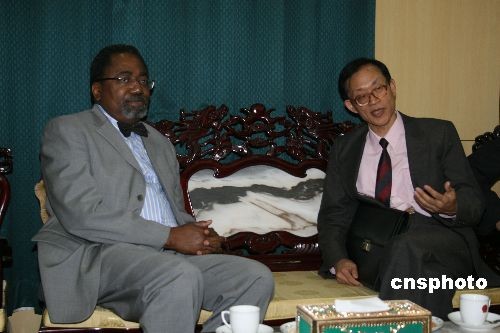 當地時間24日下午,聯合國-非盟達爾富爾維和行動聯合特別代表阿達達(左)在中國駐蘇丹使館,會見到訪蘇丹的中國政府達爾富爾問題特別代表劉貴今。中新社發 李鵬 攝