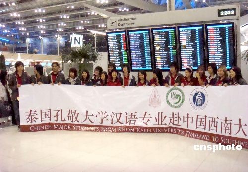 來自泰國孔敬大學孔子學院的五十七名泰籍本科生帶著家長與老師的諄諄教誨五日飛往重慶中國西南大學,開始他們在中國為期兩年的學習生活,這標志著泰國孔敬大學孔子學院與中國西南大學的“一加二加一漢語本科”合作項目正式啟動。孔敬大學孔子學院院長黃小明說,今天飛抵重慶的學生是兩校合作項目“一加二加一漢語本科”招收的第一批學生,本意是第一、第四年在泰國,第二、第三年在中國學習,畢業時學生們將得到中泰兩校頒發的畢業證書。中新社發 顧時宏 攝