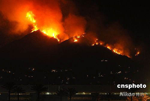 當?shù)貢r間四月二十六日下午,距離洛杉磯市中心東北十幾英里的Sierra Madre發(fā)生山林大火。截至當天午夜,大火仍在燃燒,估計過火面積約一百英畝,目前還沒有人員傷亡的報告。當?shù)叵啦块T稱,起火原因可能與近期的干燥天氣有關。去年十月,洛杉磯地區(qū)發(fā)生大規(guī)模山林大火,數(shù)千人無家可歸。中新社發(fā) 張煒 攝