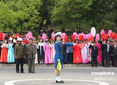 4月28日上午10時許,北京奧運圣火在朝鮮首都平壤開始傳遞。北京奧運圣火在平壤的傳遞,從主題思想塔出發,途徑中朝友誼塔、千里馬雕像、凱旋門等主要景點,最終在金日成體育場舉行慶典儀式。圖為平壤女交警在傳遞路線上指揮交通。 中新社發 沈晨 攝