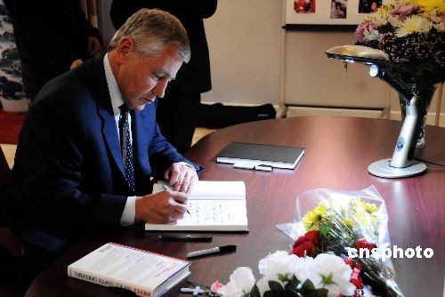 美國國會參院外交關系委員會成員、聯(lián)邦參議員恰克·黑格爾,當?shù)貢r間五月十九日傍晚來到中國駐美國大使館悼念中國四川大地震遇難者。圖為黑格爾參議員在悼念紀念冊上留言:我為那些在四川大地震中遇難的中國人民感到悲痛,我堅信中國人民在政府的支持下能夠克服目前的困難。