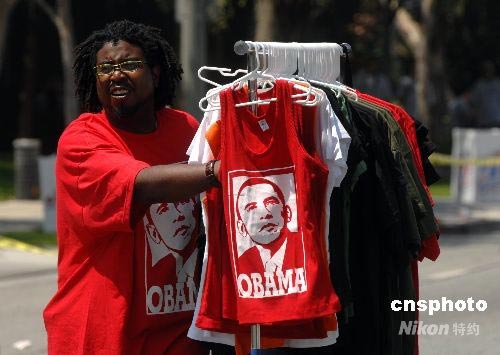 洛杉磯一名非裔小販在街頭兜售印有奧巴馬頭像的背心和T恤衫。目前,奧巴馬已穩獲美國民主黨總統候選人提名,他得到了美國大多數非裔選民的強力支持。中新社發 張煒 攝
