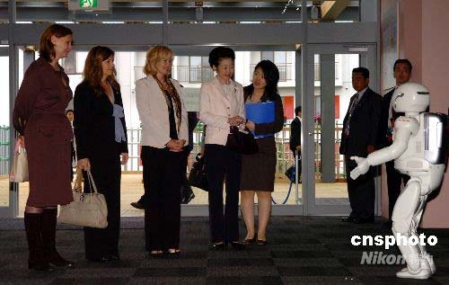 7月8日下午,在洞爺湖出席八國集團峰會的部分國家元首夫人,在日本第一夫人貴代子的陪同下參觀峰會環保型的國際新聞中心。日本公司研制的機器人asimo在門口迎接諸位夫人的到來,并用流利的英語和夫人們進行交流,令首腦夫人們驚喜不已。中新社發 朱沿華 攝