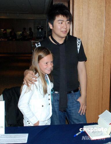 當地時間7月19日晚,中國青年鋼琴家郎朗來到位于芝加哥西郊的瑞柏市,為他不久前出版的新著《千里之行:我的故事》簽名售書,并且在當地的諾克斯教堂即興為近三百位中外來賓演奏并回答他們的問題。圖為郎朗和小樂迷合影。中新社發 張大衛 攝