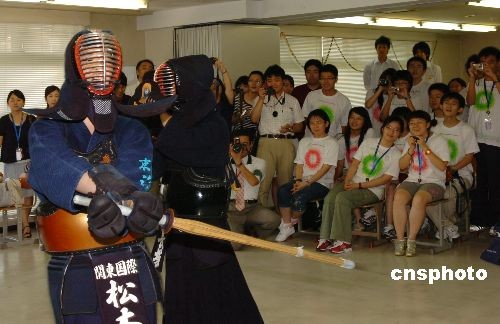 7月25日下午,“中國學生索尼訪日代表團”一行三十名高中生來到位于東京的關東國際高校進行交流。在將近兩個小時的時間里,中日兩國高中生共同進行了歌曲演唱、民樂演奏、舞蹈表演等形式的文藝表演,一起做游戲,用英、日、中文進行交流。日本學生更通過茶道、劍道表演和夏季和服展示,向遠道而來的客人介紹日本傳統文化。圖為日本同學在進行劍道表演。中新社發 朱沿華 攝