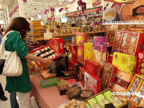 當地時間8月27日,顧客在華人超市選購月餅。中秋節將至,美國洛杉磯各大華人超級市場的中秋月餅已上架,月餅來自中國大陸、香港、臺灣,也有本地生產的月餅,品種繁多,貨量充足,海外華人慶中秋氛圍濃厚。中新社發 盧威 攝
