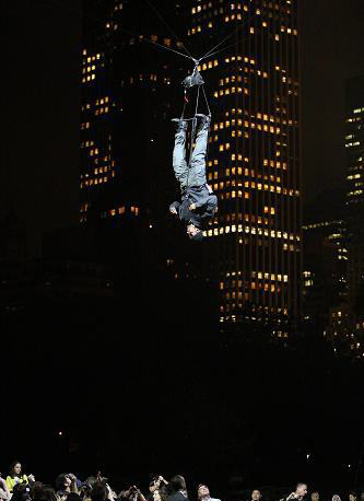 9月22日,美國魔術師大衛·布萊恩在紐約中央公園開始進行60小時的倒掛特技表演,挑戰人類極限。整個表演期間,布萊恩將不會進食也不會睡覺,只會用吸管攝入液體,并利用導液管排尿。