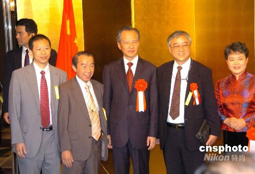 9月26日,中國駐日大使崔天凱在東京舉行盛大的國慶招待會,與日本各界人士、在日華僑華人代表共慶中華人民共和國成立五十九周年,一千五百余人應邀出席。出席招待會的華 僑華人紛紛為“神舟七號”載人飛船成功發射而感動,對祖國科技的迅速發展感到自豪。圖為橫濱華僑華人代表與崔天凱大使合影。中新社發 段躍中 攝