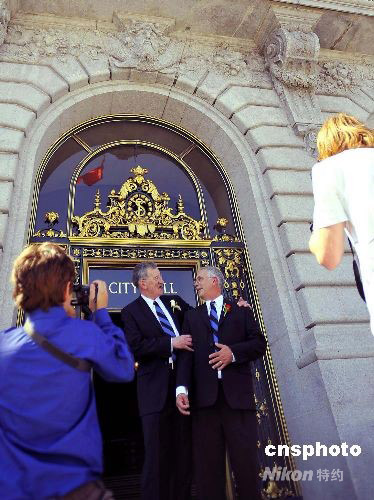 九月二十九日是美國舊金山同性戀伴侶麥卡弗和德斯勒相愛三十年的日子。三十年前的今天,他們在香港度蜜月。三十年后他們在舊金山市政府領取了結婚證書。加州最高法院裁定二00八年六月十六日是同性戀婚姻合法化的日子,但加州選民將在十一月再次對同性戀婚姻進行投票表決。中新社發 陳鋼 攝