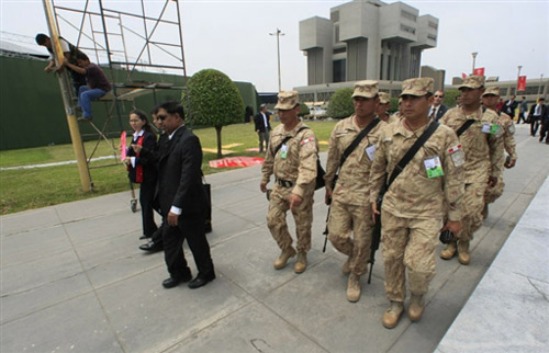 峰會期間,秘魯方面將安排3.9萬名警察在大街上巡邏,并用直升機將護送領導人衛隊,而領導人們則將在戒備森嚴的秘魯國防部內會面。
