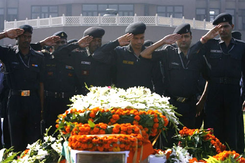 29日,數名印度國家安全衛隊的突擊隊員向在孟買恐怖襲擊案中犧牲的隊友敬禮。在持續兩天多的印度孟買連環恐怖襲擊案中,至少造成195人死亡,其中包括22名非印度籍人士,另有近300人受傷。