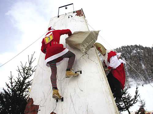 日前,瑞士阿爾卑斯山東部的一個(gè)村莊,一年一度的“圣誕老人全國(guó)錦標(biāo)賽”正在如火如荼地舉行著。來(lái)自世界各國(guó)的15支參賽隊(duì)伍紛紛使出渾身解數(shù)。這次的比賽項(xiàng)目包括了攀爬煙囪以及驢子競(jìng)賽等。在比賽過(guò)程中,參賽者們必須打扮成圣誕老人的模樣,身上還要背個(gè)裝滿(mǎn)禮物的麻包袋。