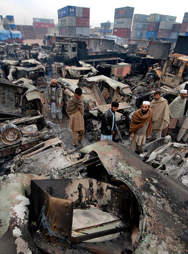 駐阿富汗美軍和北約部隊設在巴基斯坦境內的兩個后勤轉運站7日幾乎同時遭武裝分子偷襲,至少有160輛大貨車被炸毀。這是駐阿美軍后勤補給線遭受的最慘痛損失。據悉,本次襲擊發生在巴基斯坦西北部邊境城市白沙瓦附近的貨場內。