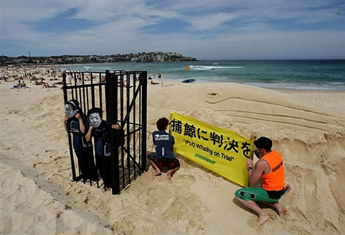 12月9日在悉尼邦迪海灘上,“綠色和平”組織成員站在一個籠子中,裝扮成日本兩位捕鯨抗議者Junichi Sato和Toru Suzuki,映射這兩位抗議者揭露日本非法捕鯨卻將被送進監獄的情況。在他們身后有一個17米長的沙雕長須鯨。