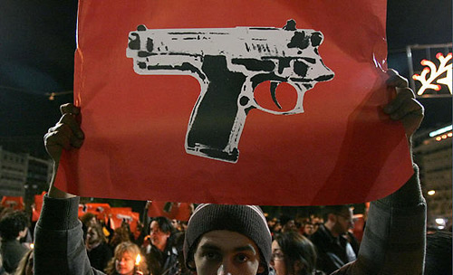 12月9日,在希臘雅典,民眾舉行和平集會,抗議警察打死15歲的少年格里戈羅普洛斯。格里戈羅普洛斯的葬禮當天在雅典郊外舉行。12月6日晚,這名少年在沖突中被警察開槍打死,由此引發希臘全國主要城市多日騷亂。