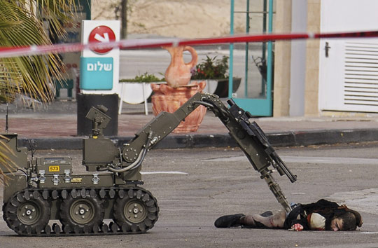 圖為以色列警方機器人在檢查被擊斃的襲擊者身上是否帶有爆炸物。