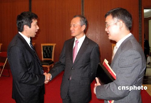 近日,中國駐日本大使崔天凱在東京舉辦2009旅日華僑華人新春招待會。會上,崔大使親切會見了日本人漢語征文大賽主辦者和贊助單位負(fù)責(zé)人,聽取他們的匯報(bào)。圖為崔大使會見大賽贊助單位社長。中新社發(fā) 段躍中 攝