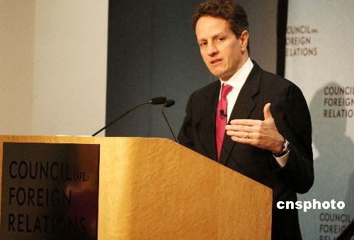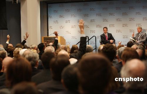 25日,美國財政部長蓋特納在位于紐約的美國外交關系協(xié)會(CFR)發(fā)表演講時表示對美元很有信心,“美元的基礎地位應該不會改變”。蓋特納同時表示,政府應該對金融公司有更大的控制權。圖為蓋特納接受美國外交關系協(xié)會會員提問。中新社發(fā) 魏晞 攝