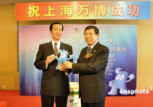 4月13日下午,日本“上海世博推介周”中的重要環節——“上海與上海世博會”圖片展,在東京羽田機場開幕。圖片展將持續到本月底,計劃在羽田機場、京濱急行列車“世博號”以及其他東京地鐵列車和站臺上展出反映上海城市風情、市民生活、世博籌備等各方面的圖片共700幅,以讓日本市民直觀、生動地了解上海與上海世博會的最新情況。圖為上海世博會執委會常務副主任、上海市常務副市長楊雄(右),向東京都副知事菅原秀夫贈送上海世博會吉祥物海寶。中新社發 關妍 攝