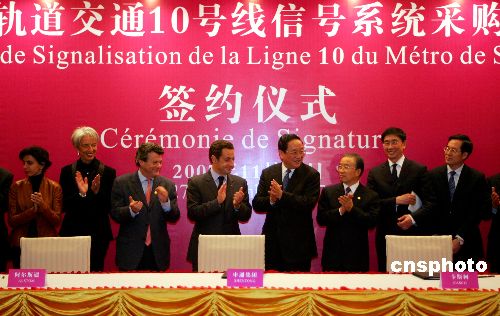 11月27日,中共中央政治局委員、上海市委書記俞正聲(右四),與在上海訪問(wèn)的法國(guó)總統(tǒng)尼古拉·薩科齊(左四),共同出席上海申通地鐵集團(tuán)公司與法國(guó)阿爾斯通公司關(guān)于上海軌道交通10號(hào)線信號(hào)系統(tǒng)采購(gòu)合同簽約儀式。中新社發(fā) 湯彥俊 攝
