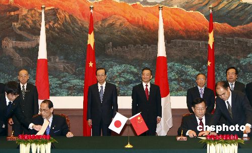中日領導人出席雙方有關合作文件的簽字儀式