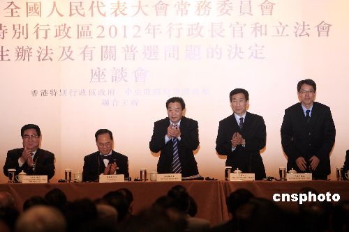 十二月二十九日,全國人大常委會副秘書長喬曉陽(右3)、全國人大常委會法制工作委員會副主任李飛(右2)和國務院港澳事務辦公室副主任張曉明(右1),專程來港出席座談會,說明全國人大常委會就香港特別行政區2012年行政長官和立法會產生辦法及有關普選的問題的決定。中新社發 王麗南 攝