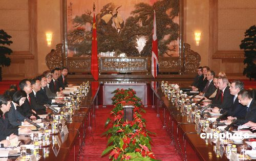 一月十八日,中國國務院總理溫家寶在北京人民大會堂與英國首相布朗舉行會談。中新社發 廖文靜 攝